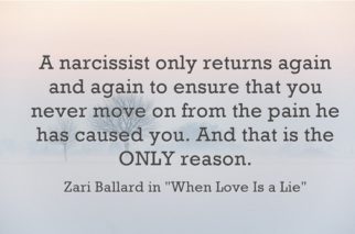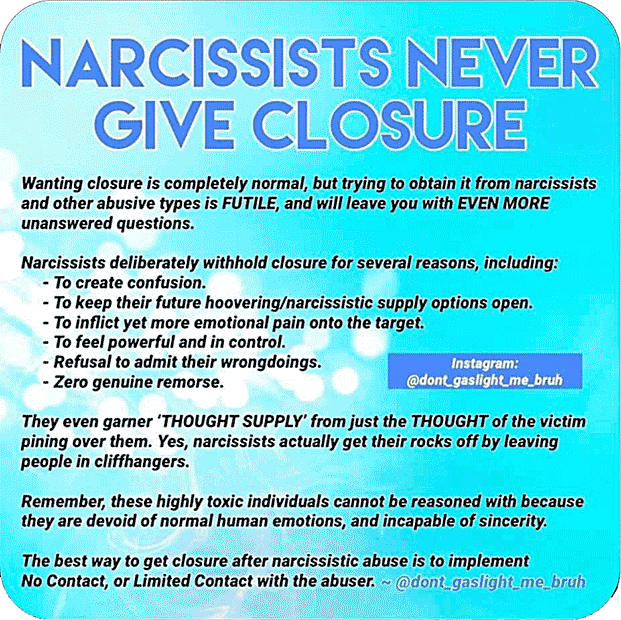 Cu un narc, nu exista incheiere (engl. “closure”). Nu te astepta vreodata sa ai discutia aceea rezonabila — de final si “debriefing” pe care o poti avea cu un om normal — despre ce a dus la despartire, si despre felul cum drumurile voastre vor continua separat. In niciun caz nu vei avea asta. Doar oamenii nomali pot avea asa ceva.